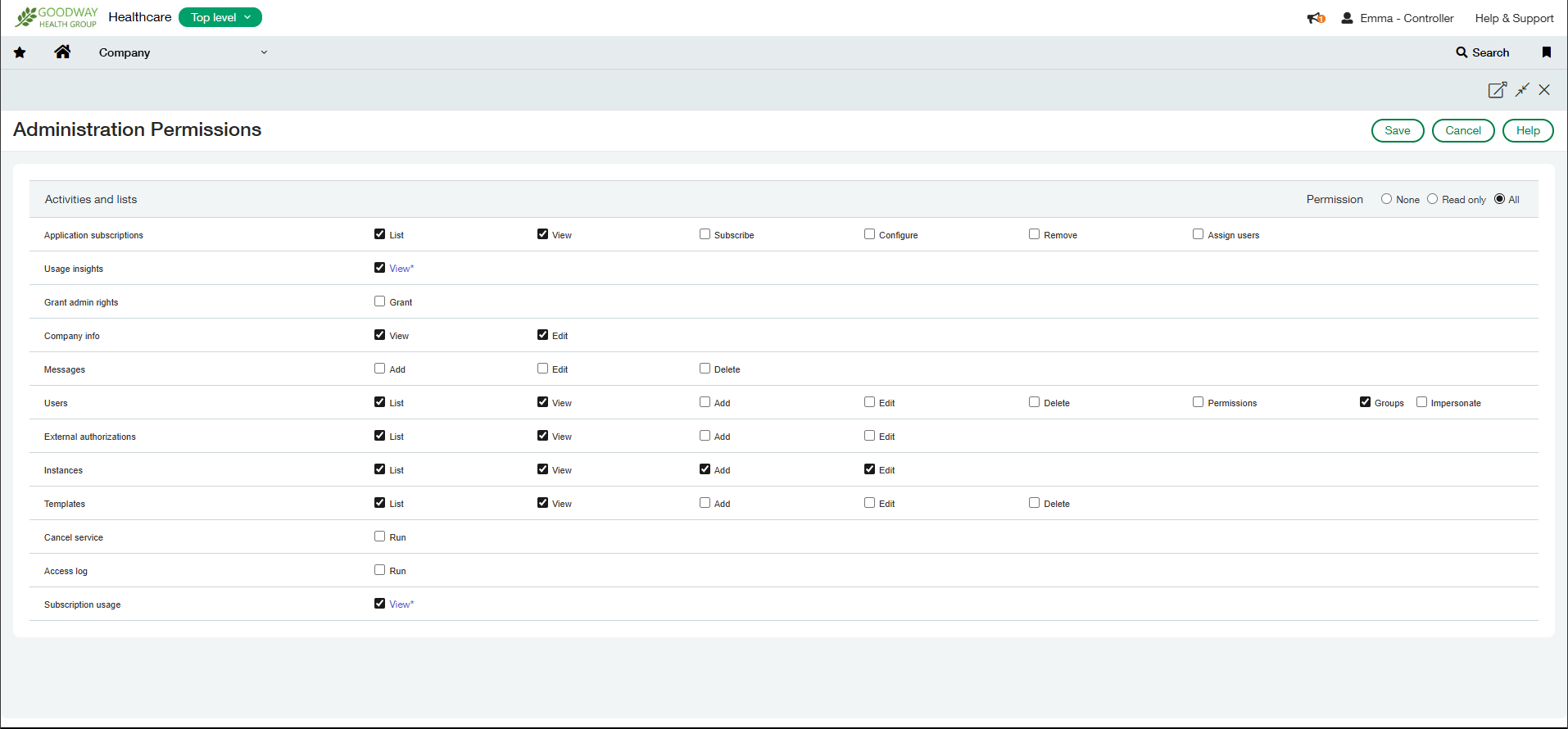 Depending on whether the company is set-up for role or user based permissions, the exact route to granting the correct permissions will vary slightly. If only role based permissions are set-up then a role with the correct permissions must be assigned. If user permissions are set-up then the user is amended directly - either way the subscription settings should be set to 'All' on the following modules (whether this is against the user or the role):