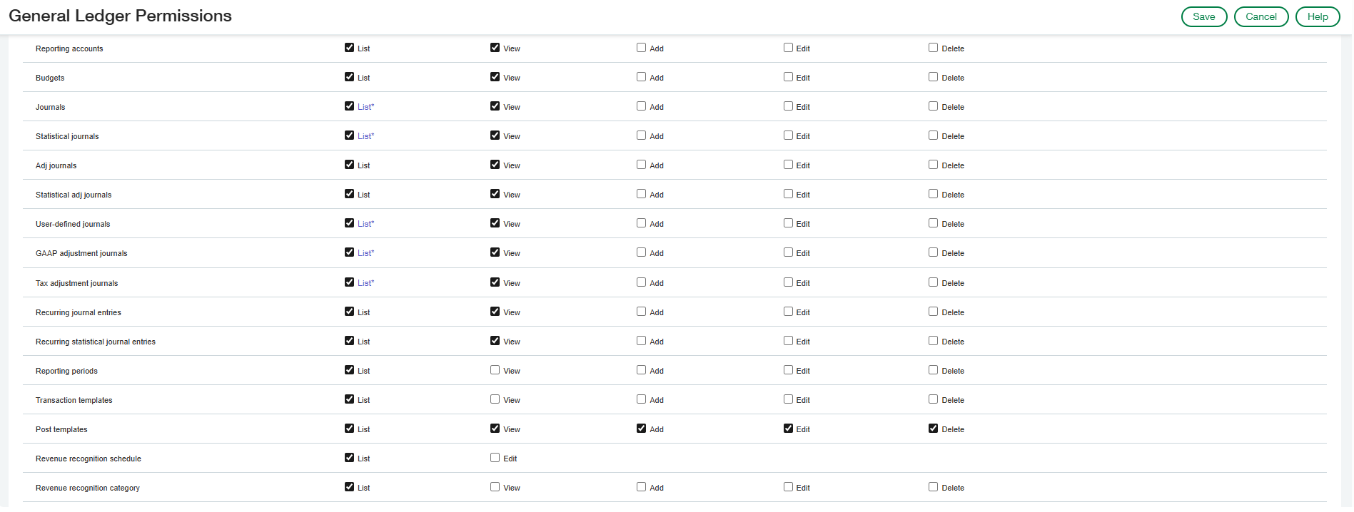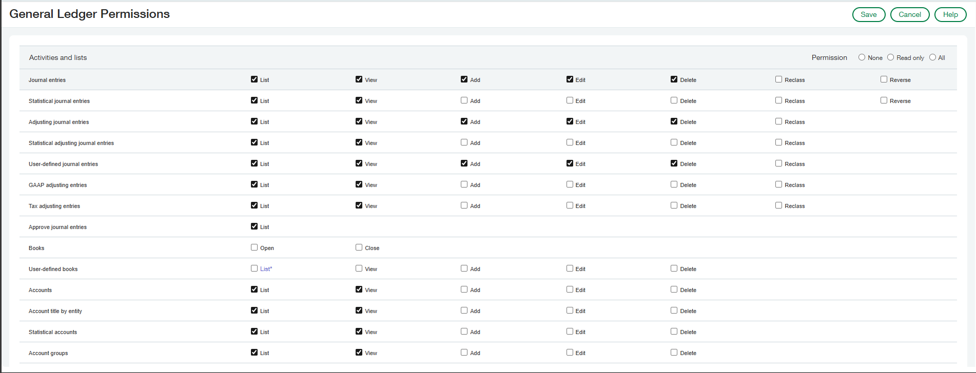 Under General Ledger Permissions select All permissions then Disable the following: