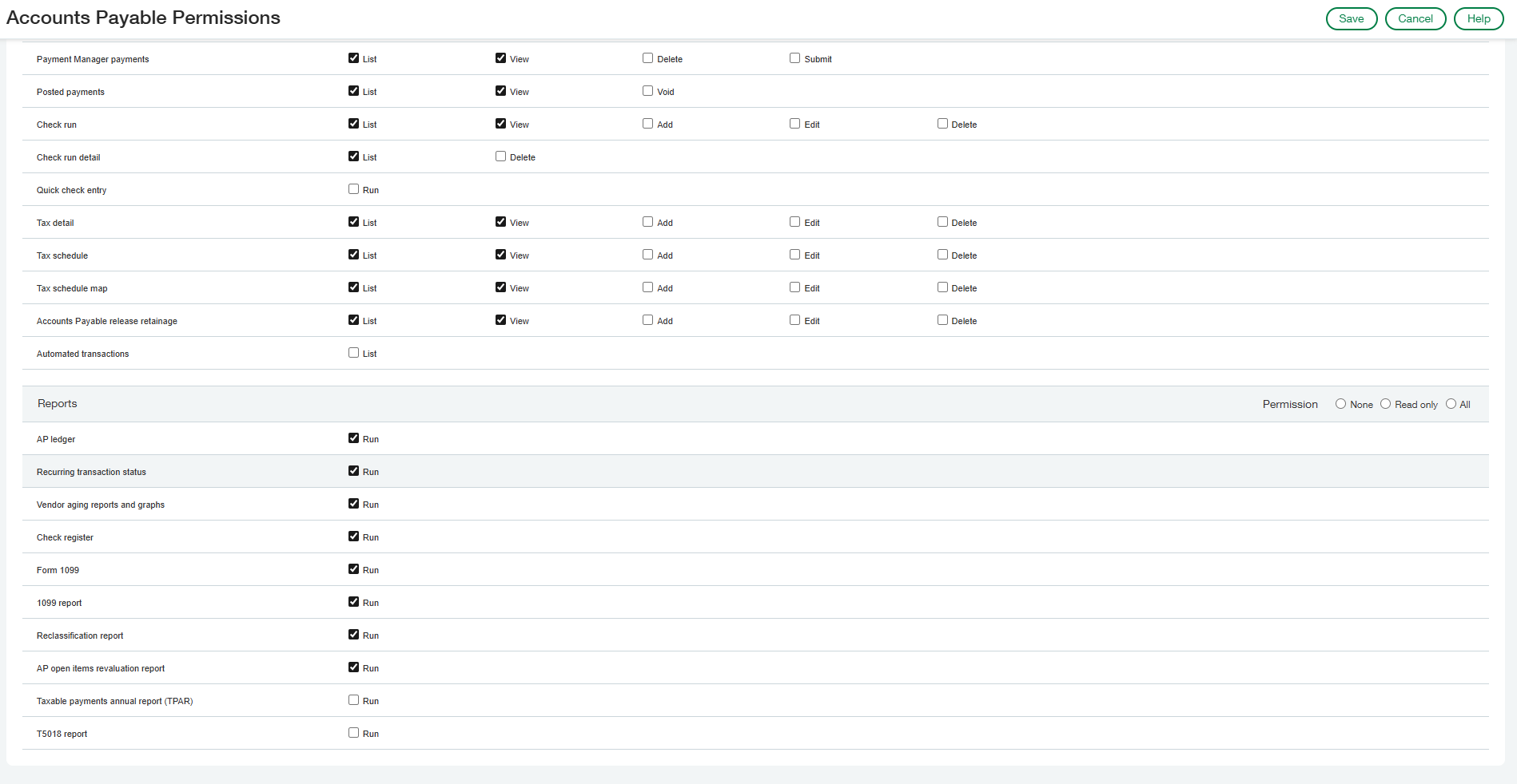 Under Accounts Payable Permissions select All permissions then Disable the following: